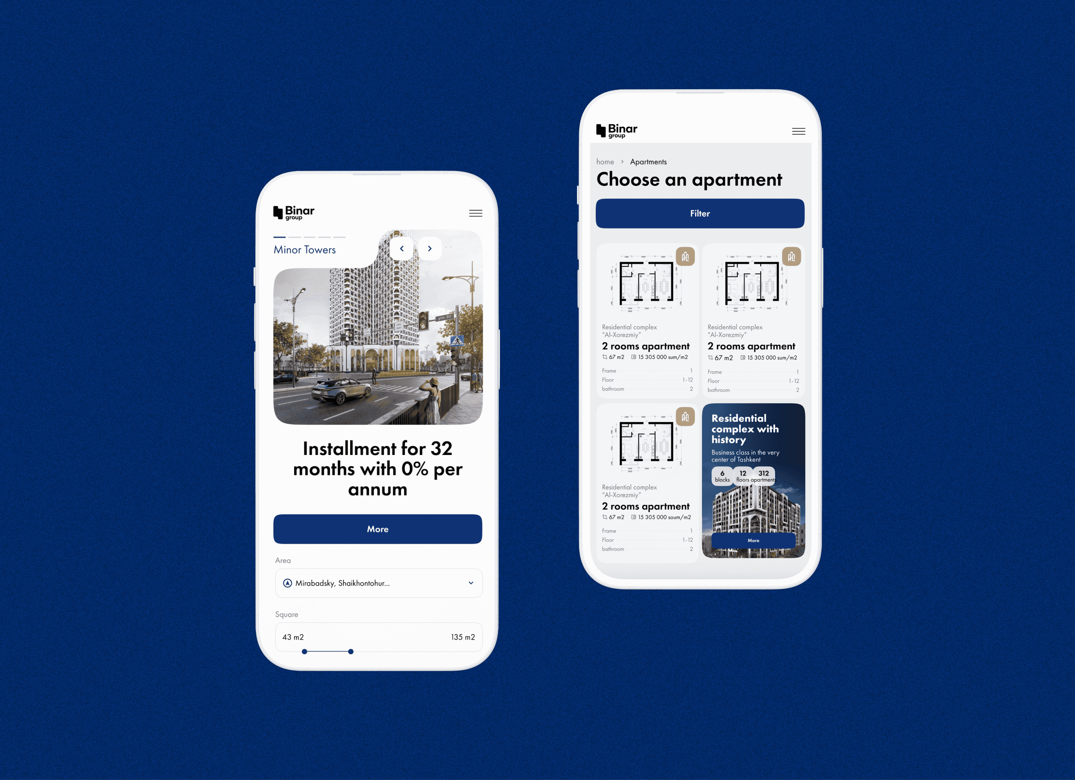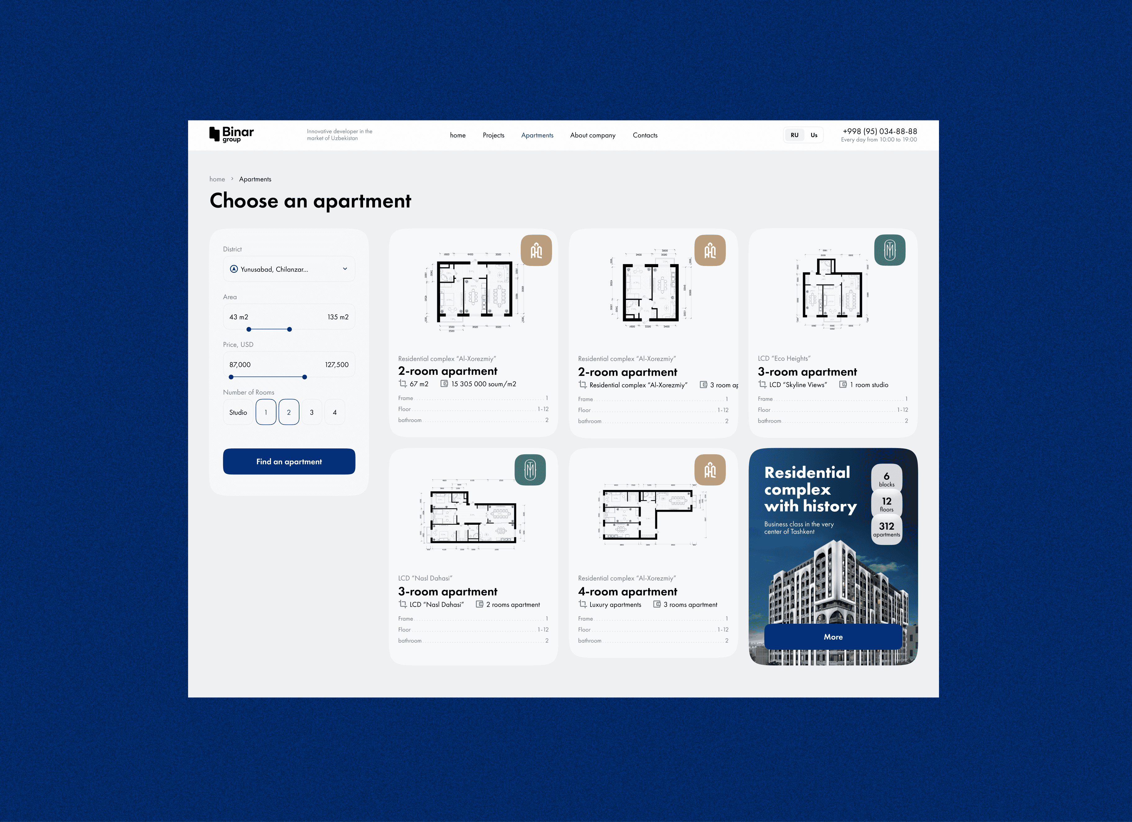 The final result is a modern real estate platform that simplifies the apartment selection process. Users can quickly discover residential complexes, compare options, and learn about payment plans and purchasing conditions.