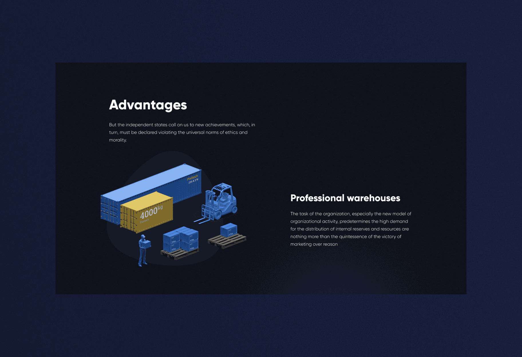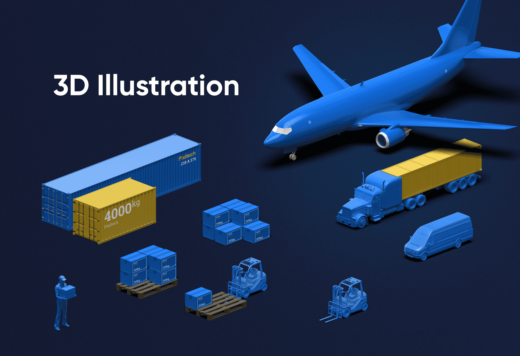 Logistics elements such as containers, trucks, warehouses, and cargo transportation were visualized to create a clear and modern product presentation.